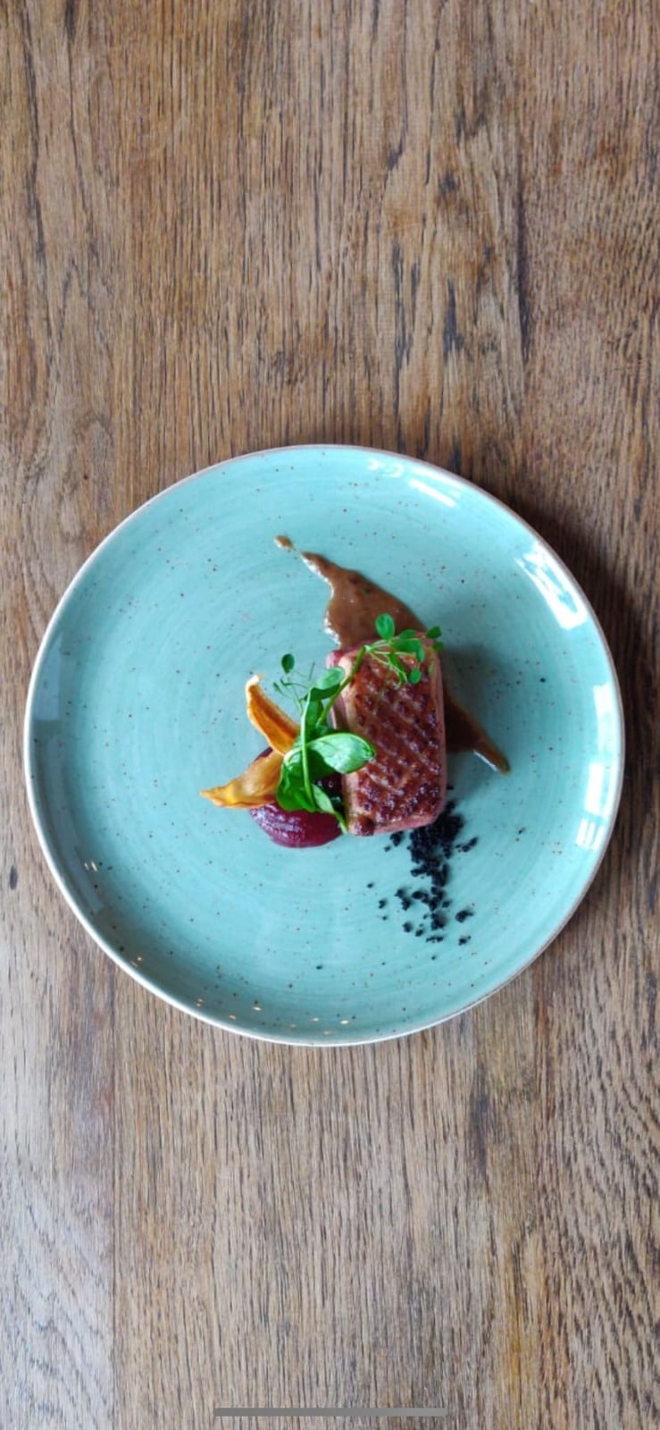 Gepekelde eendenborst – pompoen – wit en roodlof – crumble van 5 spicyen – zachte stroop van Madera wijn
